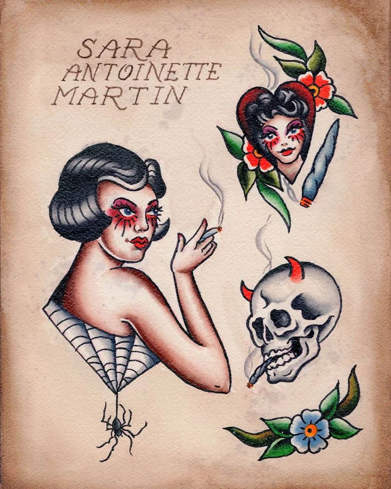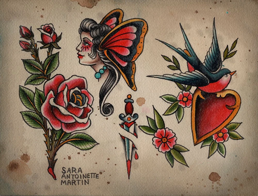 This series revisits American Traditional tattoo flash—redrawn, repainted, and reimagined by hand. Each design is built on the bold lines and classic motifs of traditional tattooing, updated with richer color palettes and subtle shifts in expression and style. These pieces are available as original paintings or prints and can also be tattooed by S.A. Martin at World’s Fair Tattoo in Astoria, Queens. Everything is available in color or black + grey and prices may go up depending on size and placement.